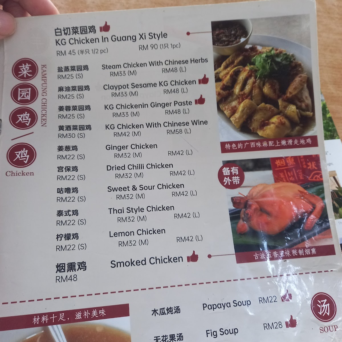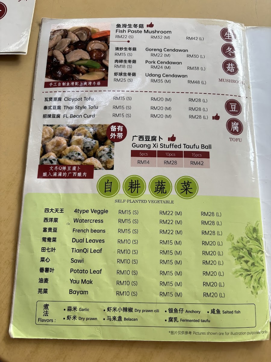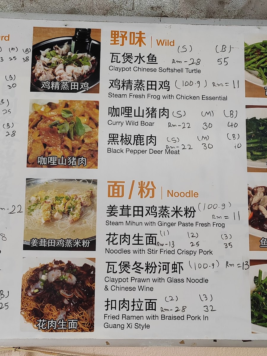 The menu offers a variety of Chinese dishes with an emphasis on traditional flavors and local ingredients. It features a selection of steamed and claypot dishes, including fish, chicken, and pork prepared with soy sauce, ginger, and other classic seasonings. There are also several vegetable-based options such as local leafy greens and farmer's vegetables, along with specialty meats like wild boar curry.