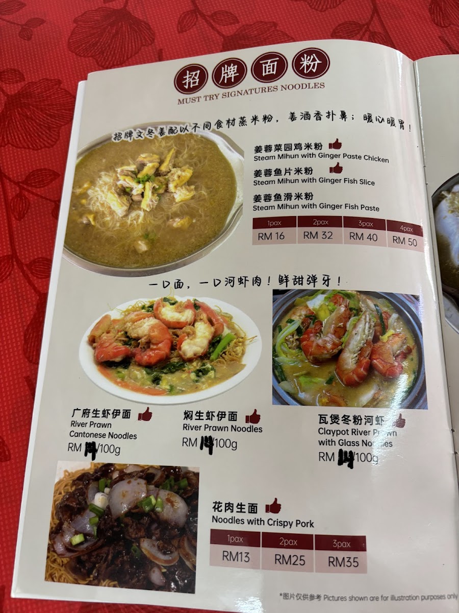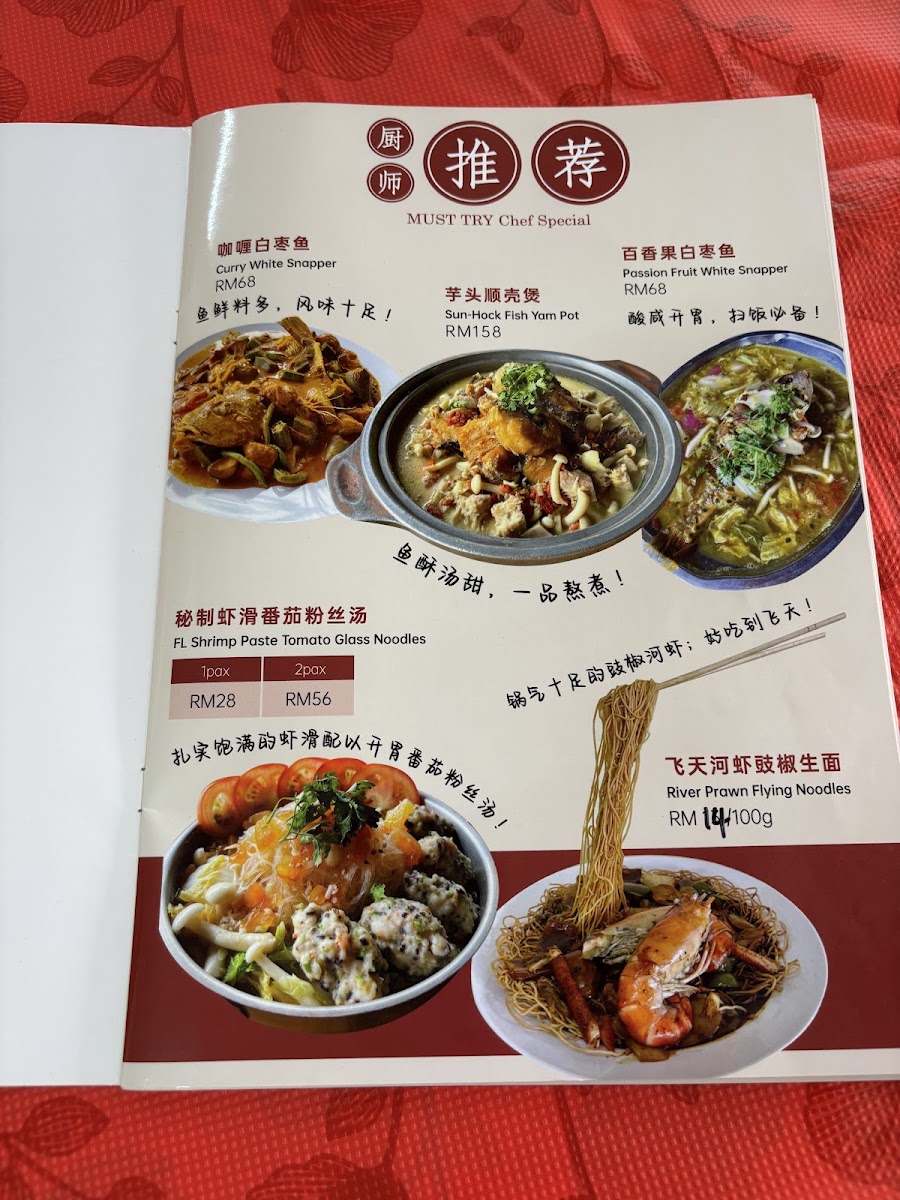 In addition to main dishes, the menu includes noodle and rice options, such as fried ramen with braised pork, ginger chicken mee hoon, and fried rice. Steamed tofu dishes and regional specialties like Guangdong style tofu with pork are available, showcasing a range of textures and flavors. For beverages, fresh fruit juices including passion fruit juice with honey are part of the offering.